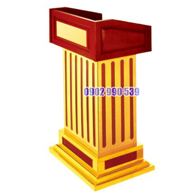 - Bục phát biểu có bề mặt được làm bằng gỗ nâu đỏ, toàn thể bục được thiết kế pha trộn giữa gỗ và inox mạ vàng tạo điểm nhấn